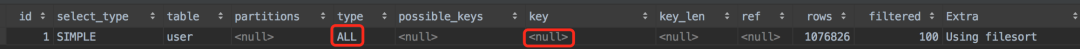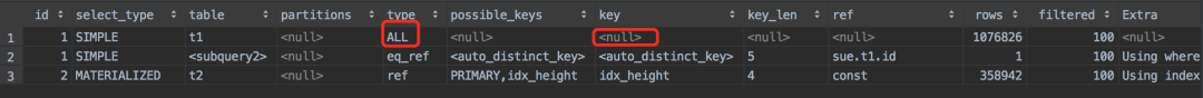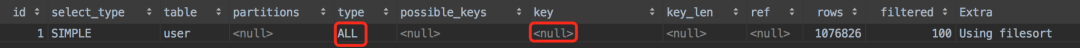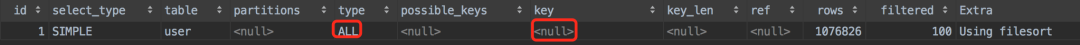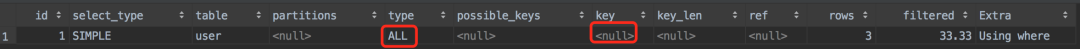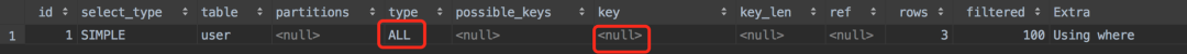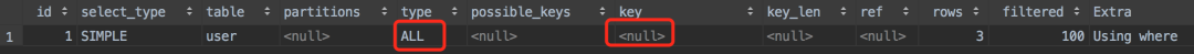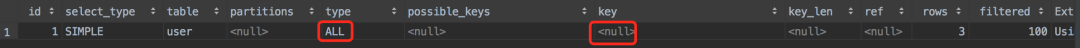 在该sql中用了 select * ,从执行结果看,走了全表扫描,没有用到任何索引,查询效率是非常低的。