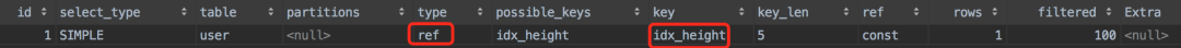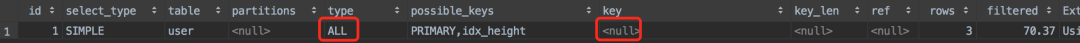 id字段本身是有主键索引的,同时height字段也建了普通索引的,并且两个字段都是int类型,类型是一样的。